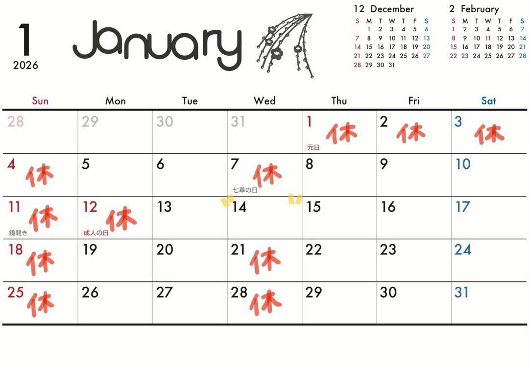 【お知らせ】1月休診日&土曜日予約状況 NEW